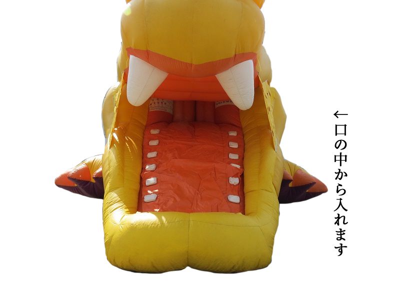 何と!ドラゴンの口の中から入るようになっているドラゴンバウンスのレンタルページです。 空気を送り込んで完成させるタイプのエア遊具はいろいろあれど、このようにドラゴンの口から入れるとなると、最初からテンションが上がりますね。 勇気を出して口の中からドラゴンの体の中へ入って遊んでみましょう。 もちろん大きな口を開けているところは撮影スポットにも最適です。 ワクワク、ドキドキするドラゴンバウンスです。