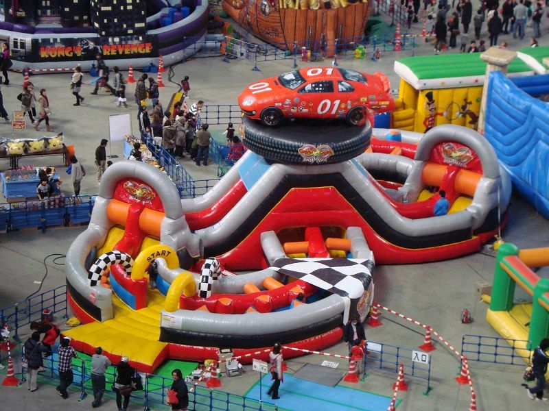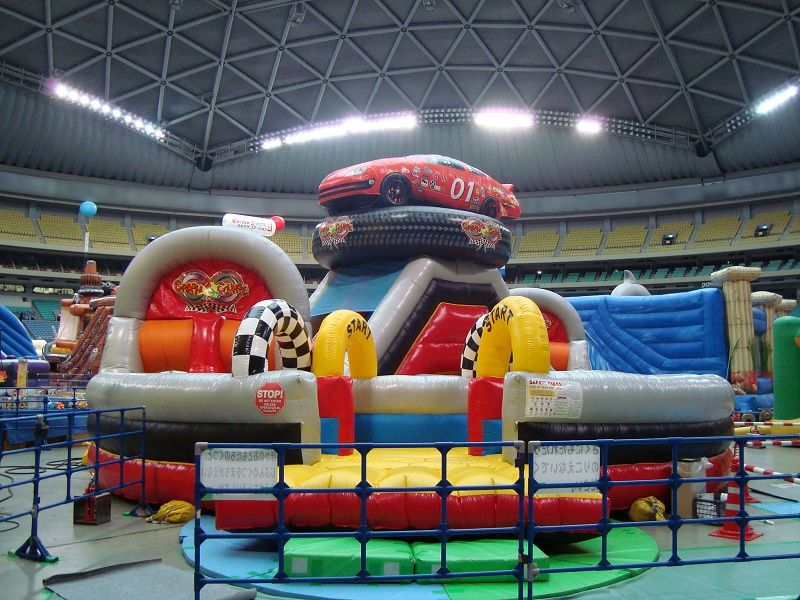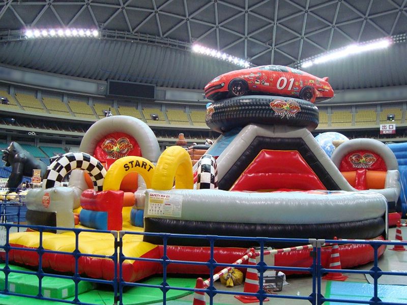 こちらのクラッシュサーキットコースは、空気を送り込んで完成させるエア遊具です。 レーンが2つに分かれていて、競争することもできます。 また、サーキットコースの中には障害物もあり、スライダーで滑るとワクワクドキドキすること間違いなしです。 車や乗り物関係のイベントのキッズコーナーや、お子様が多くいらっしゃる催し物に最適なエア遊具です。