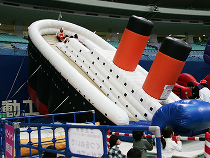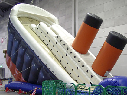 寝転びながらスライダーを滑る様子も見られるタイタニックスライダー レンタルのお知らせです。 あの有名な大きな客船が今にも沈みそうなシーンを再現したエア遊具の客船滑り台です。 船のサイズは奥行と高さの両方が10m以上あり、非常にインパクトがあります。 船の傾きが滑り台の角度と同じになっていて、急降下で滑り降りることができるため、スリルを求めるお子様には非常に喜ばれます。