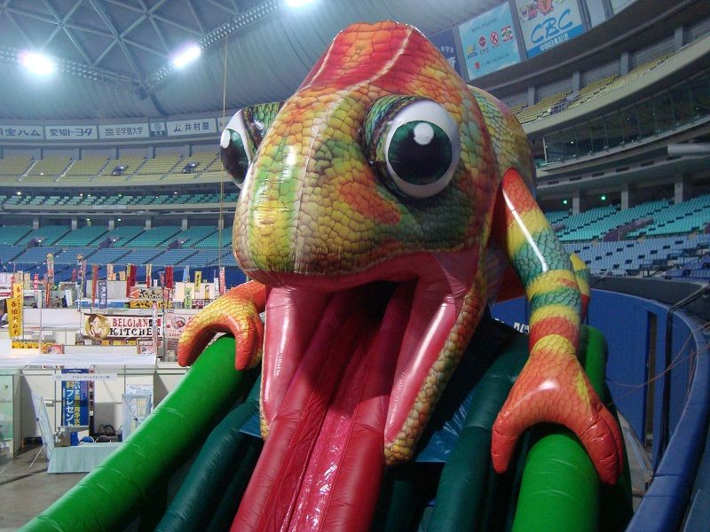 大きなカメレオンの長い舌を見ると、いかにも食べられてしまいそうです。 こちらのカメレオンスライダーは、怖くて遊びに行けないお子様もいらっしゃるかもしれませんが、滑り降りてくる様子は、まさに撮影ポイントとなります。 また高さが約9mもありますので、滑り台にしてはかなりの高さがあり、通常の遊具では物足りないお子様に最適です。 光に反射する舌の色が妙にリアルなのも、カメレオンらしく見えます。