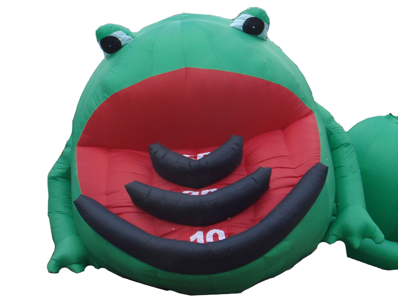 あんぐり口を大きく開けたカエルの口にボールを入れる、カエルのボール入れゲーム レンタルのページです。 送風機を使って空気を送り込んで膨らませると、あっという間に高さ2.3mのカエルができあがります。 口の中には得点が書かれた的があり、そこにボールを投げるだけのシンプルな遊びです。 配点が高い的ほど小さくなっているので、大人の方はもちろん、小さいお子様も保護者の方の補助付きで気軽に遊べます。 ファミリーで参加されるような催し物に是非ご利用ください。