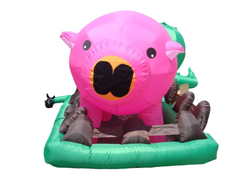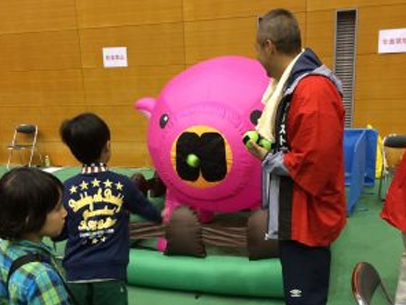 マジックテープがついたボールをブタの鼻にくっつけるというとてもシンプルでわかりやすい遊び方ができるブタさん的当てゲームのレンタルページです。 ブタの鼻の面積が思ったよりと小さいので、結構難易度は高く、上手くそこにくっつけよう夢中になれるゲームです。 大人も子供も遊べますし、空気を入れるだけでできあがるので室内で遊ぶゲームコーナー作りにいかがでしょうか。 小さなお子様が遊ぶ際には、ボールを投げる距離を近くにしてあげるようにすると難易度が下がるので上手く調節してあげてください。