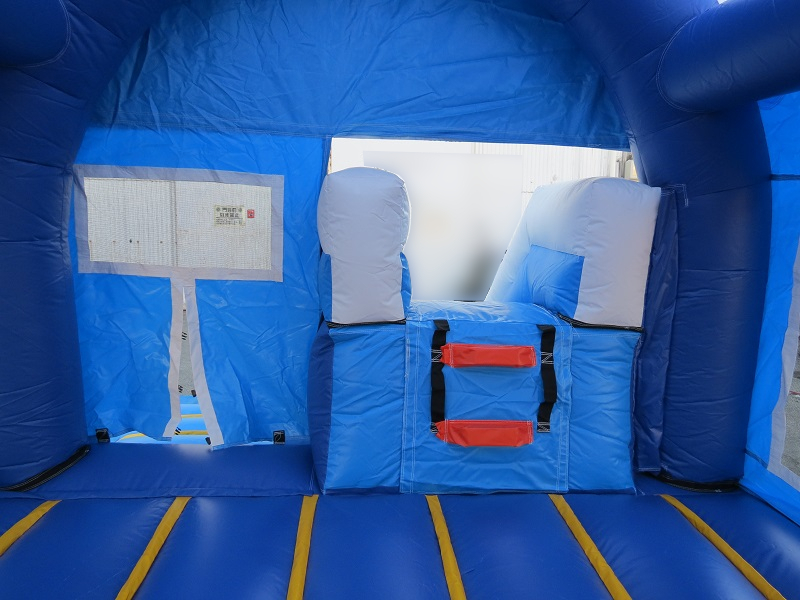 夏のイベントにぴったりな、海のような深い青い色合いが特徴的で目立つオーシャンコンボのレンタルページです。 上部には小さい魚と、それを食べようと追うサメの絵が描かれています。 こちらのオーシャンコンボには、ドームだけではなくスライダーも一緒にありますので、お子様達も飛び跳ねる以外に滑り台で遊ぶこともできます。 スライダーで遊ぶ時は、ドーム内にある赤い足場を上って滑ります。 小さいお子様が多く集まるイベントや、夏や海に関するイベントでのご利用がお勧めです。
