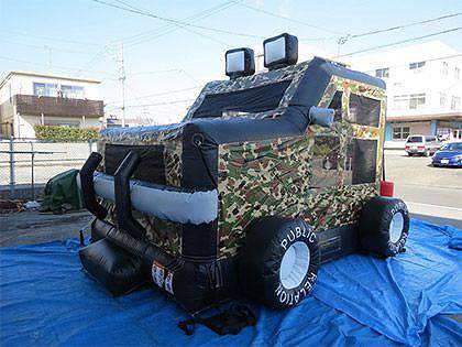 迷彩柄のジープを模したジープバウンスのご紹介です。 設置は、送風機で空気を送り込んで、完成させるだけととても簡単です。 ジープ車の窓の部分がメッシュになっていて、保護者の方が中で遊んでいる様子が外からも見守ることができます。 車関係のイベントにはもちろんのこと、サファリパークをイメージして移動動物園などでもお使いいただけます。 弊社にはさまざまなバウンス遊具を多数ご用意していますので、お気軽にお問い合わせください。