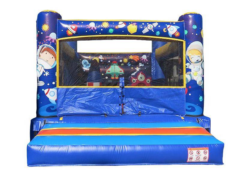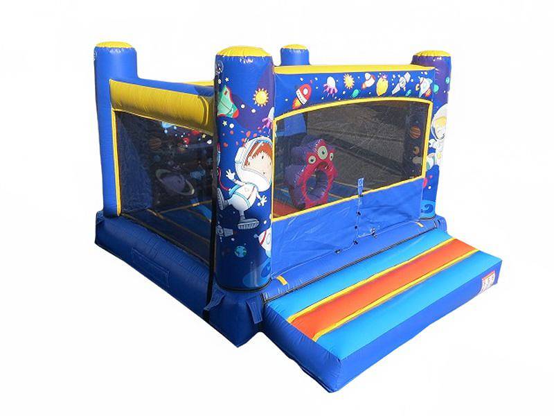 宇宙や星関係のイベントで活用できるかわいらしい宇宙飛行士や惑星、ロケットのイラストが描かれた宇宙バウンスのご紹介です。 ブロアーで空気を送り込んで、完成させるだけの簡単設置でできあがります。 保護者の方は、大きなネットの窓があるので、そこから見守ることもできます。 宇宙バウンスの中は、空気で膨らませたふわふわの床でまるで宇宙飛行士のように飛んだり跳ねたりして遊べます。