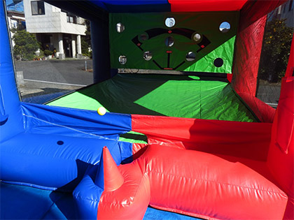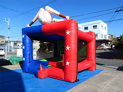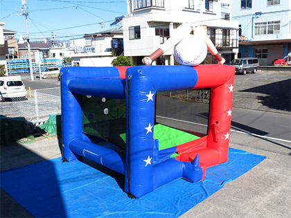 こちらのエアー式バッティングゲームは、打ったボールをきちんと穴に入れられるかチャレンジするゲームです。 遊び方は非常に単純で、空気がずっと出続けているところにボールを浮かせて、バットで10個ある穴のどこかに入れることができるかチャレンジします。 大人でも狙った穴に入れるのはなかなか難しいゲームです。 そうなると我こそはとチャレンジしたくなるものなので、スポーツ関係のイベントのゲームコーナーでご活用ください。