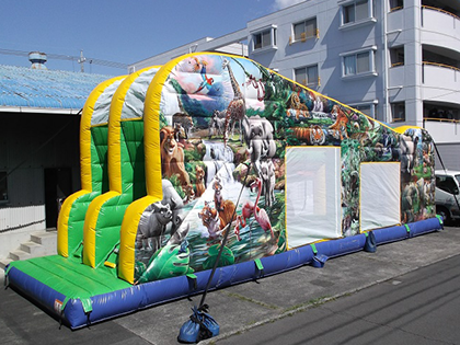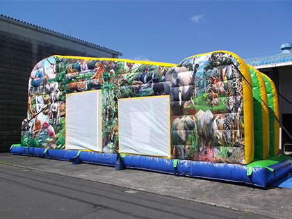 大型公園で見たことがある方もいらっしゃるであろうジャングルダブルジップラインのレンタルページです。 ワイヤーロープをプーリーと呼ばれる滑車を使って滑り降りる遊びで、疾走感があってドキドキする遊具です。 遊具の外側にはゾウやトラなど子供たちが大好きないろいろな動物たちのデザインです。 また保護者の方は外から遊具の中で遊んでいる様子が見られますので安心できます。 空気を送り込んで膨らませるだけで、簡単に完成できるエア遊具です。