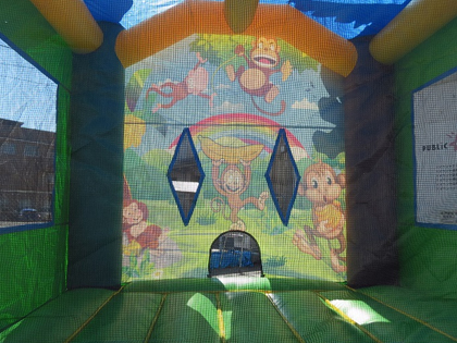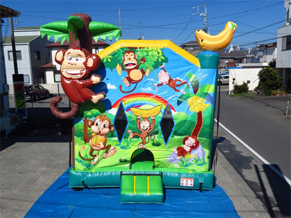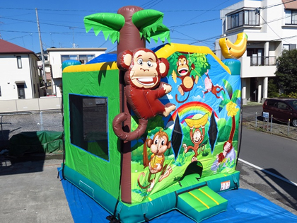 子供たちが飛び跳ねて喜ぶモンキーランドバウンスのレンタルページです。 こちらのモンキーランドバウンスは、約5m四方のややコンパクトなバウンスで、それほど広いスペースが確保できなくても設置ができます。 入り口はひょうきん者のお猿たちがバナナを持ってお出迎えしているデザインで、子供たちが入りやすい印象です。 明るい色合いの雰囲気が楽しい気分を誘います。 狭い入り口から中に入ると、床も天井も何もかもが空気で膨らませたバウンスになっているので、寝転んだり、思い切り跳ね回ることができます。 側面は大きなメッシュがついていますので、外から保護者の方が見守ることも可能です。