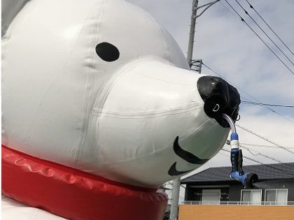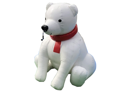 送風機を使って空気を送り込んで膨らませて使うシロクマ型ミスト発生機のレンタルページです。 設置時は特に電源は必要なく、お好きな場所でお使いいただけます。 膨らむと高さ約3.1mになり、意外と高さがありますので、目立つこと請け合いです。 シロクマの鼻のところにシャワーがついていて、そこからミストが出て涼が取れます。 ファミリーイベントなど、大勢の人が集まる場所でのご使用にいかがでしょうか。