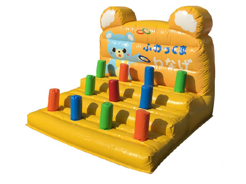 かわいらしい水色のくまがトレードマークになっているクマさんビンゴゲームのレンタルをご紹介します。 こちらのクマさんビンゴゲームは、大型で、カラフルなスティックの輪投げにです。 設置方法は非常に簡単で、空気を送り込んで膨らませるだけで、それほど準備には手間もかからず簡単にできあがります。 小さなお子様も保護者の方の補助があれば遊ぶことができますので、ファミリーイベントにいかがでしょうか。